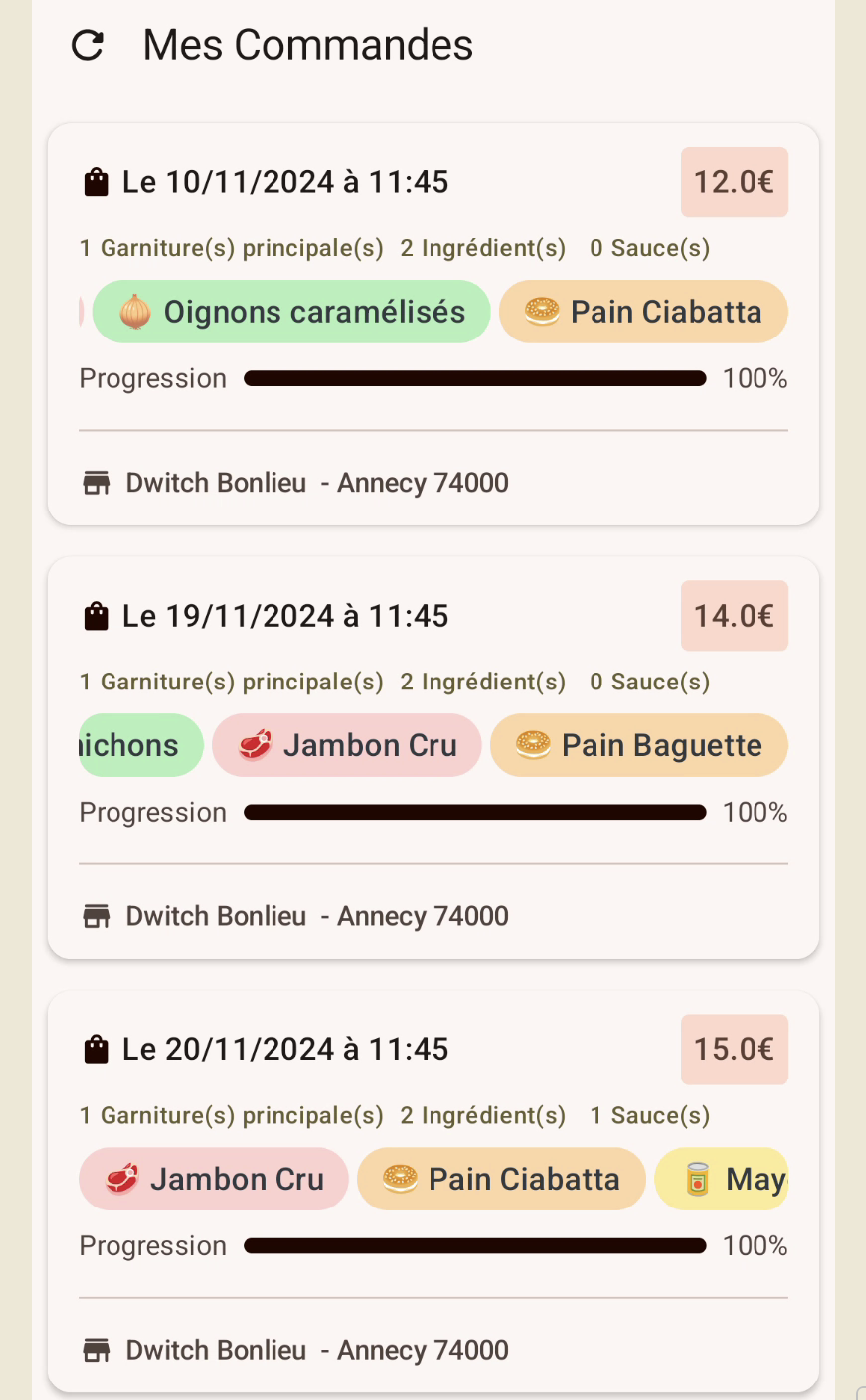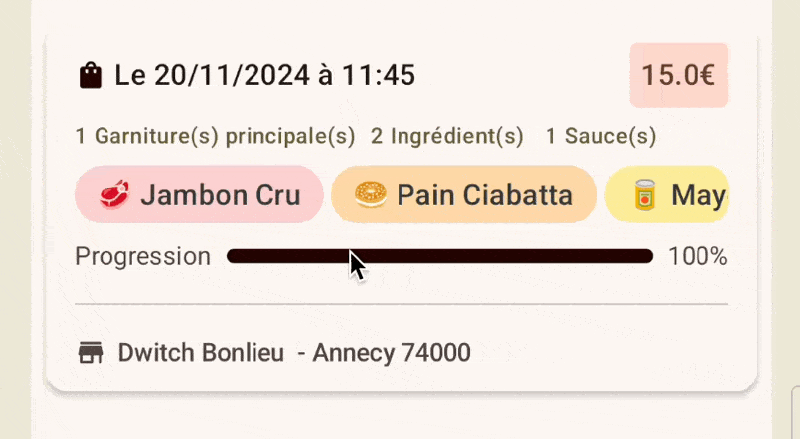 Scaffold pour la structure de la pageTopAppBar pour la barre de navigationLazyColumn pour afficher la liste des commandesLazyRow pour afficher les ingrédientsRow et Column pour organiser les élémentsIcon | IconButton pour afficher des icônesText pour afficher du texteCard ou Surface pour mettre en forme les éléments avec des ombresLinearProgressIndicator pour afficher une barre de progressionAttention, les ingrédients sont scrollables horizontalement :