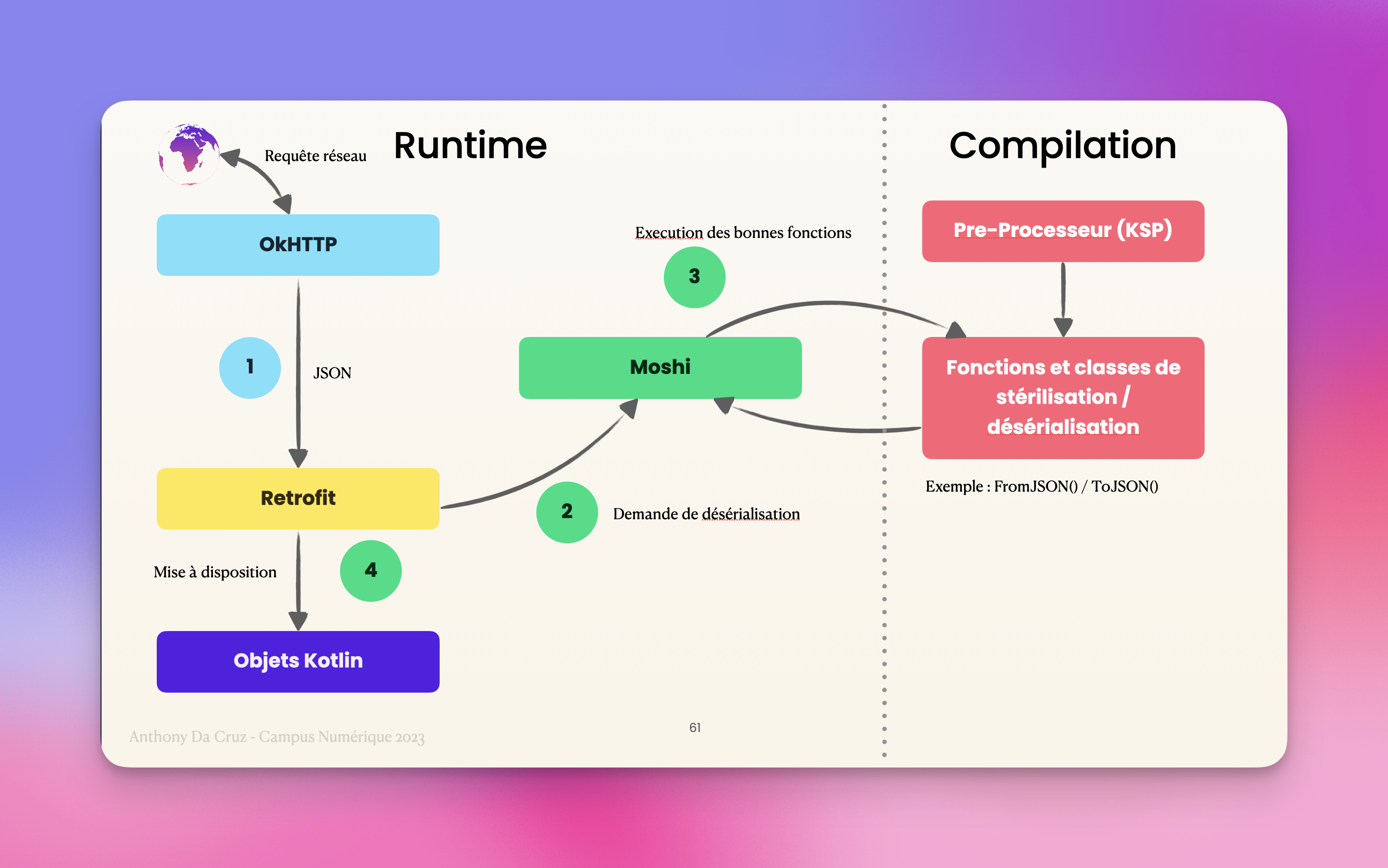 Moshi est une librairie qui permet de convertir des données JSON en objets Kotlin, et vice-versa. Pour simplifier la conversion des données, nous allons utiliser le KSP pour générer automatiquement les JsonAdapter pour chaque type de données que nous souhaitons convertir.