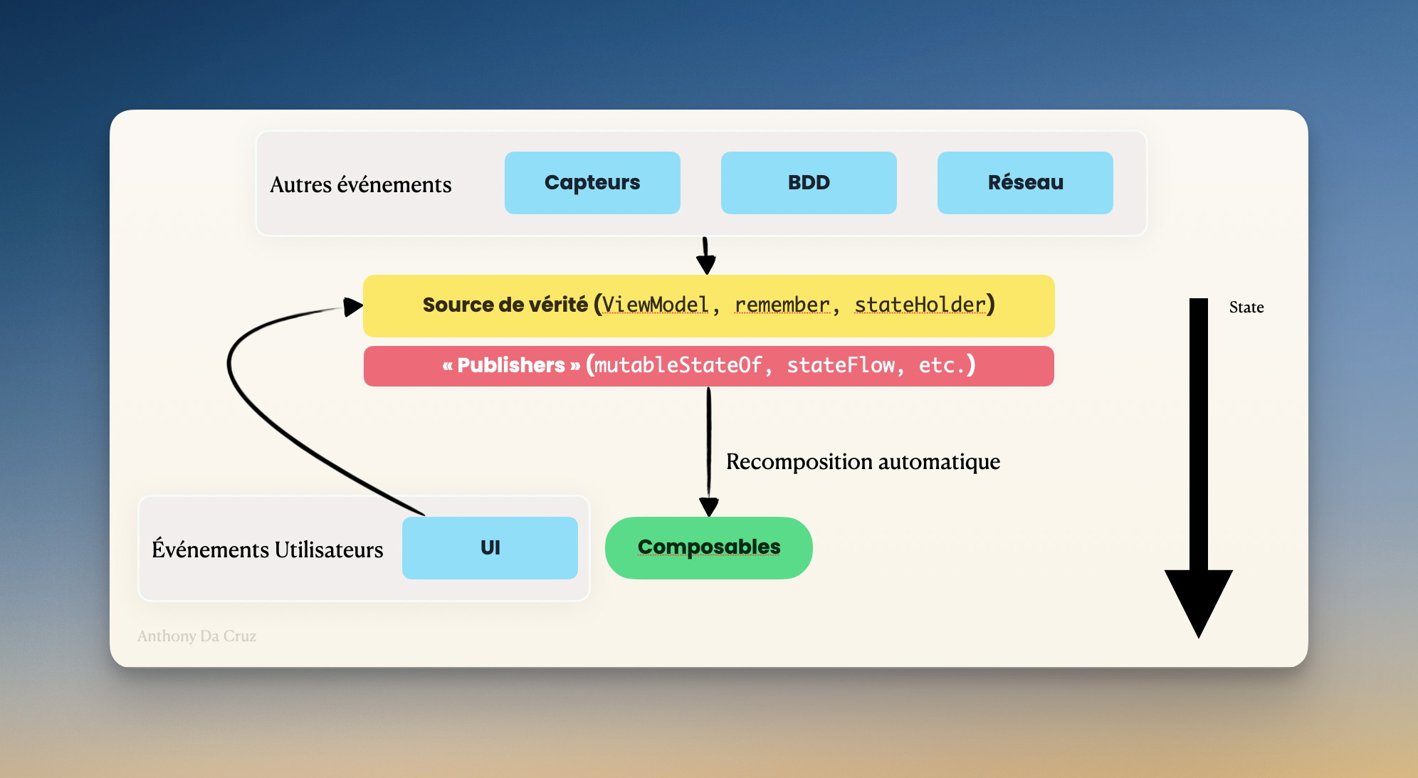 Dans cette architecture moderne, c’est bien les données qui drive l’UI et non l’inverse.