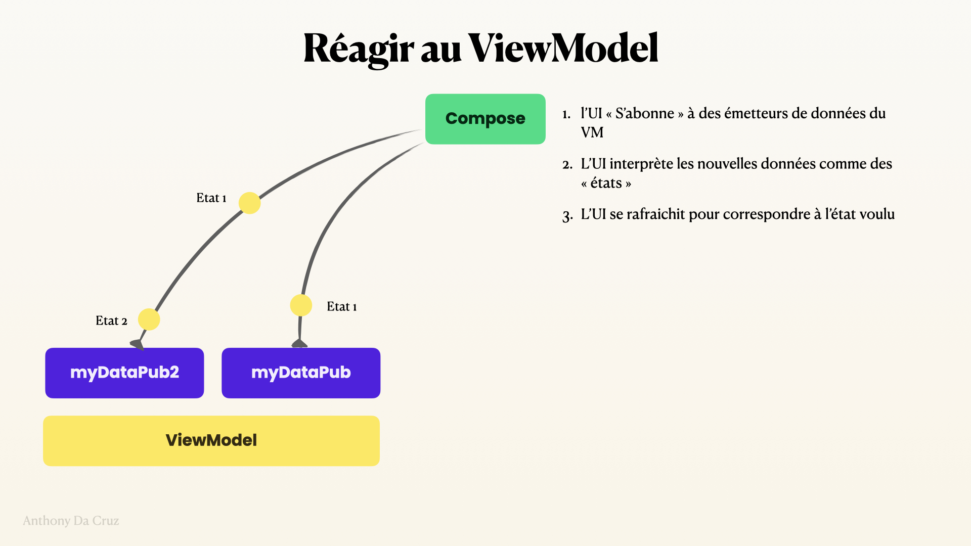 Les 3 outils ont leur propre particularités, mais le principe reste le même : un composant s’abonne à un Publisher (le viewModel) pour être notifié des changements d’état.