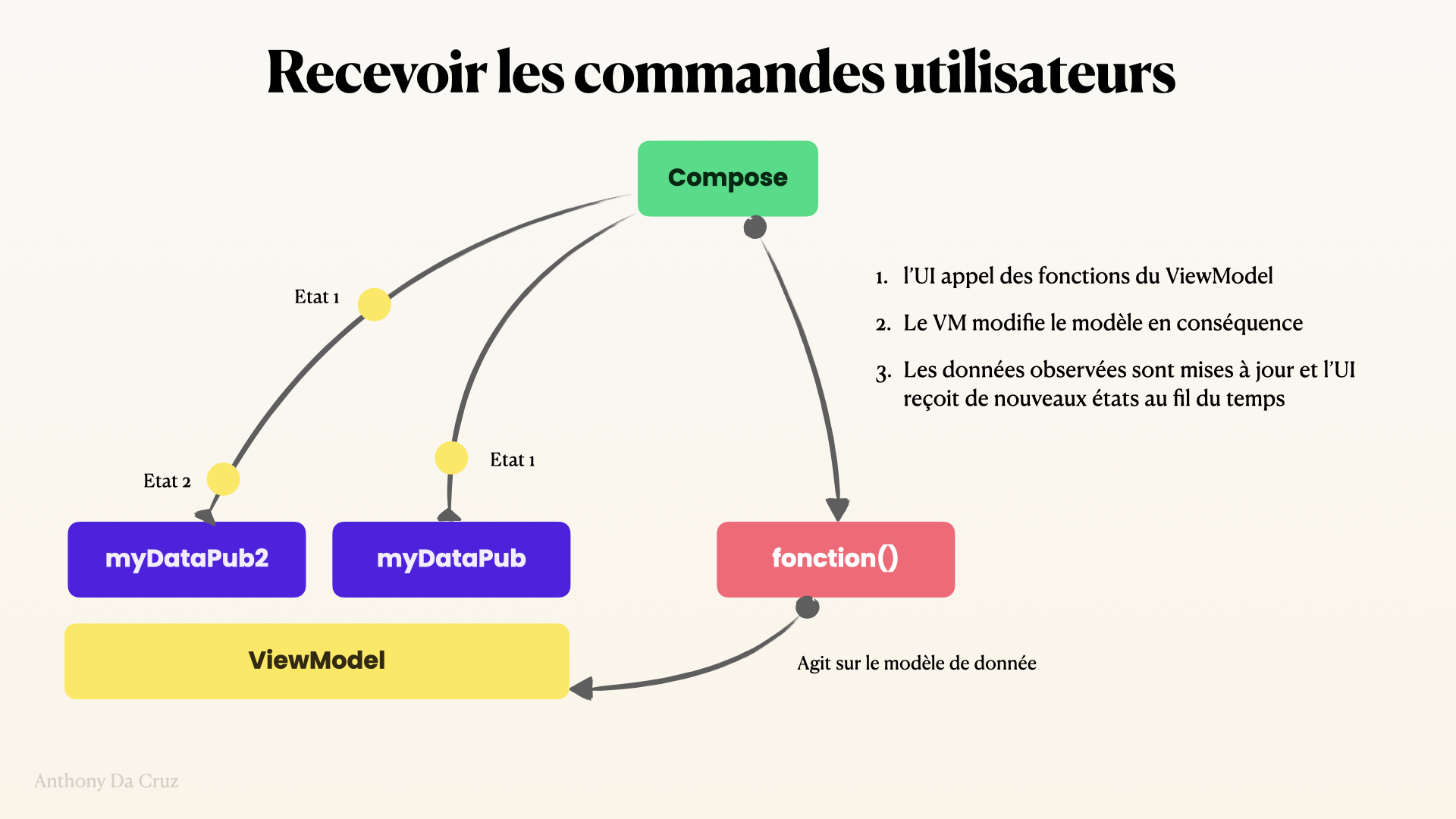 Une règle d’or : Ne jamais modifier l’état d’un viewModel directement depuis un composant de l’UI.