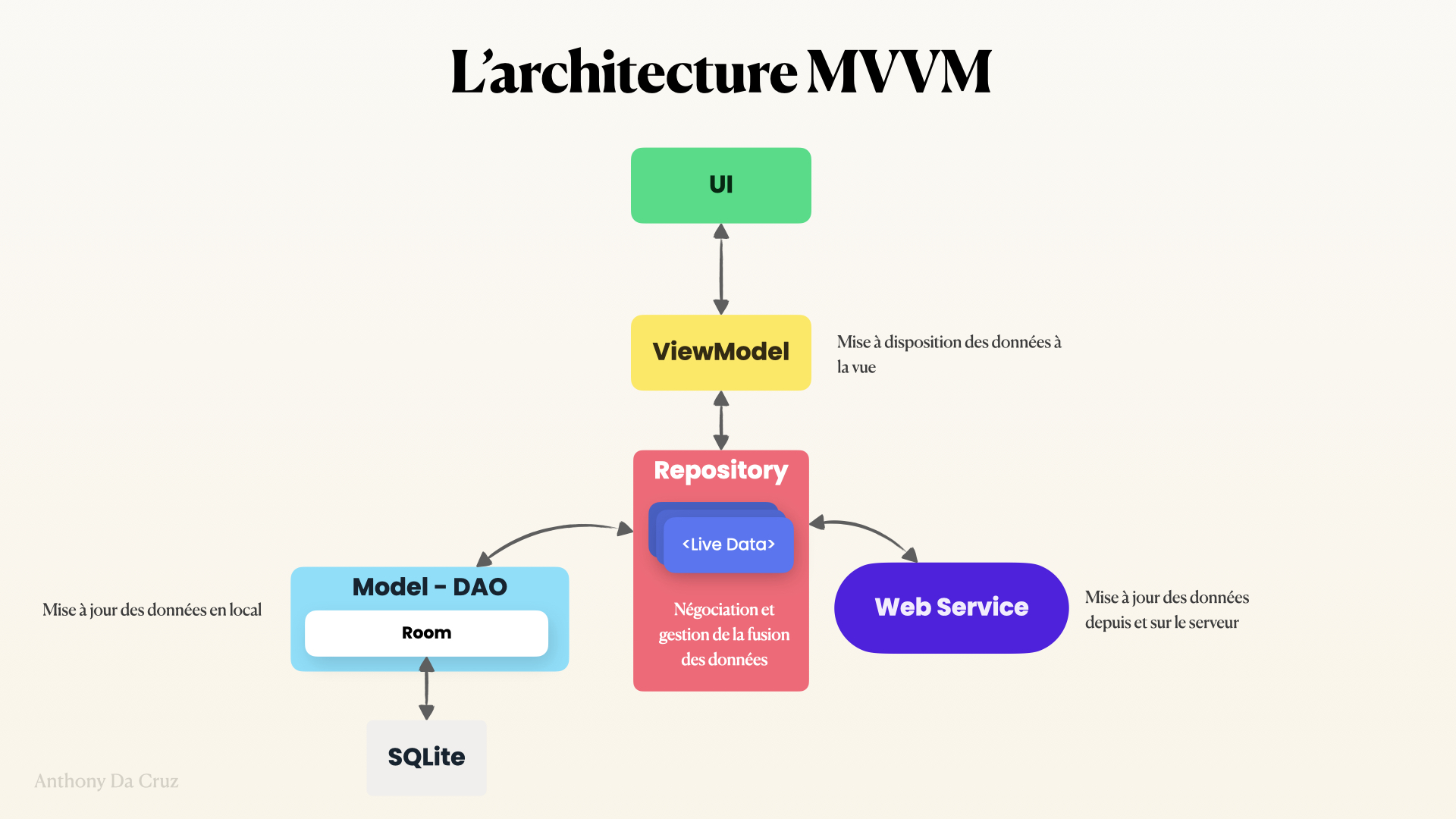 L’architecture MVVM sous Android se traduit par l’utilisation de ViewModel pour gérer l’état de l’UI et faire le liens avec les données.